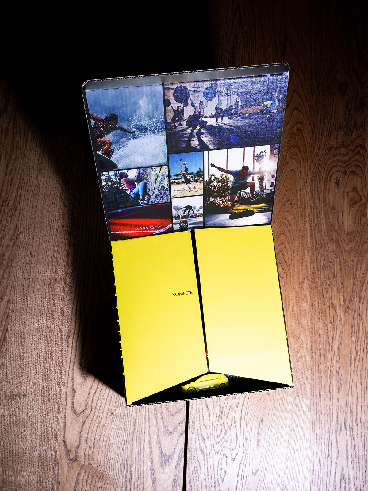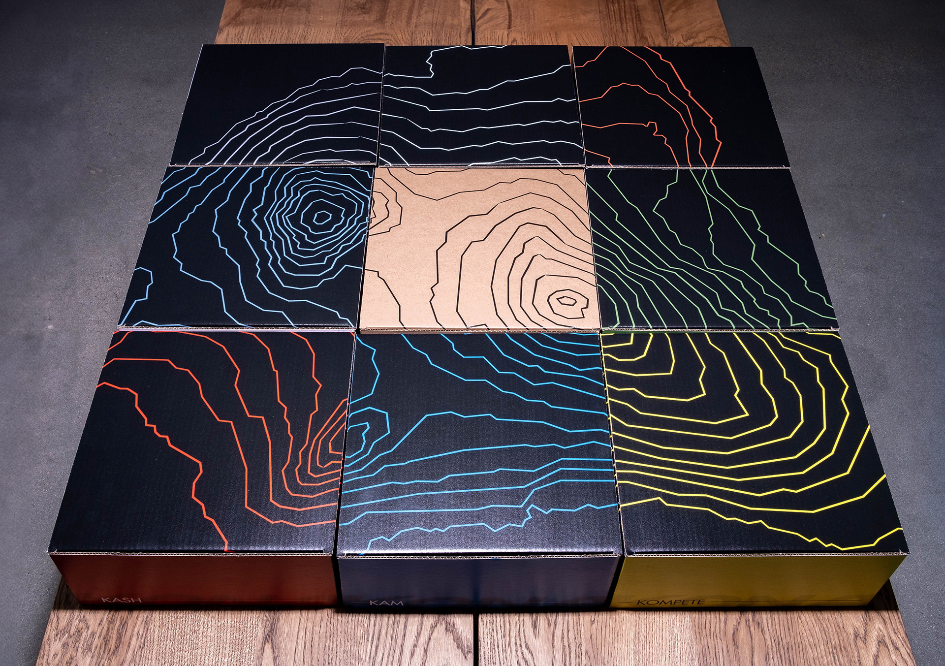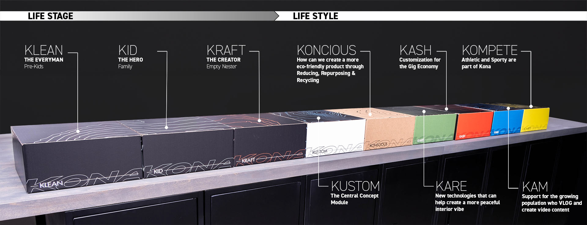 Put together the boxes make a topographical map of the Island Kona. The concept being that each of the life stages or lifestyles are a part of the Kona and the complete picture cannot be seen until they are all together.
